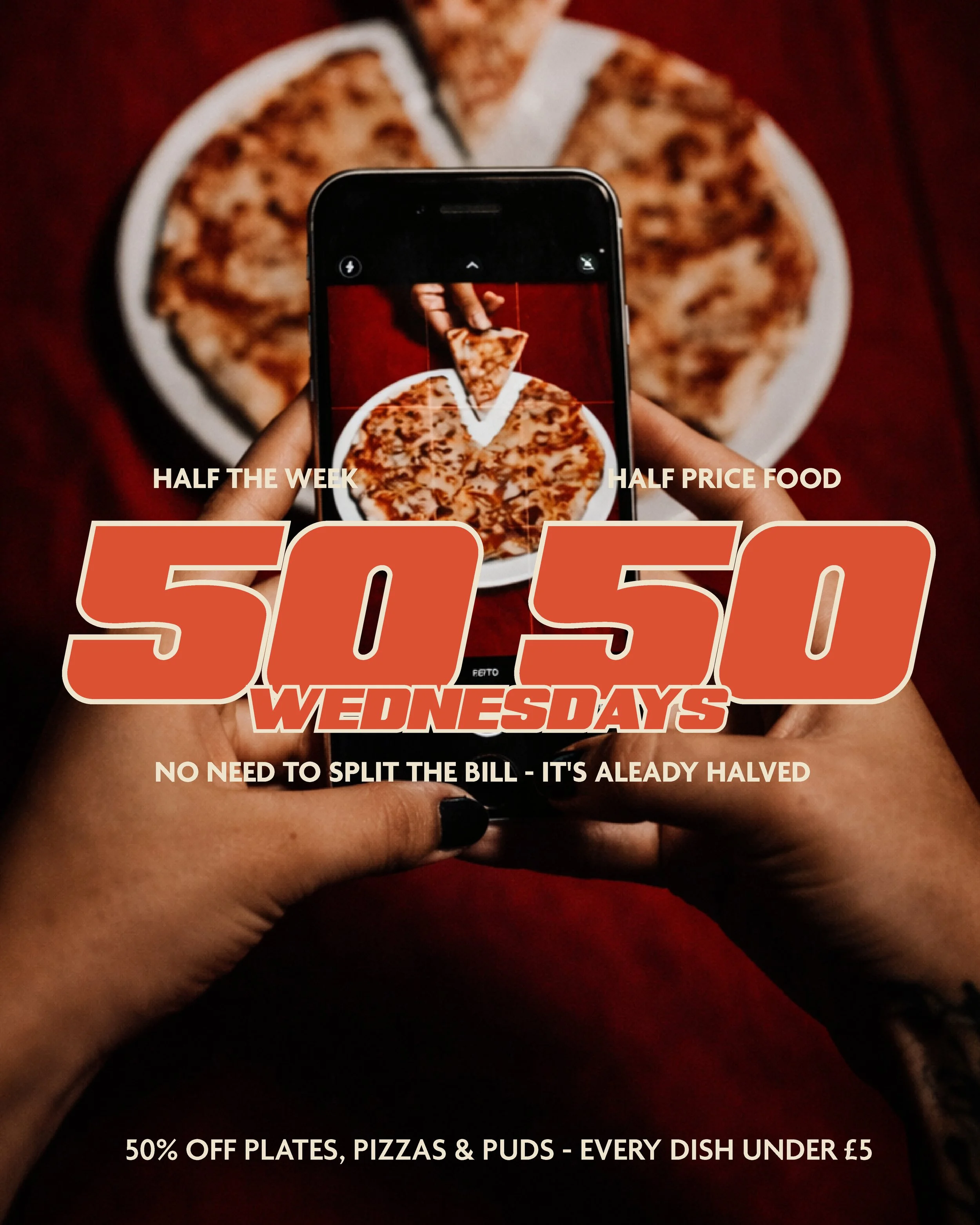 That’s half price plates, half price pizza and half price puds. Perfect for mates, dates or when you just can’t be bothered to cook.